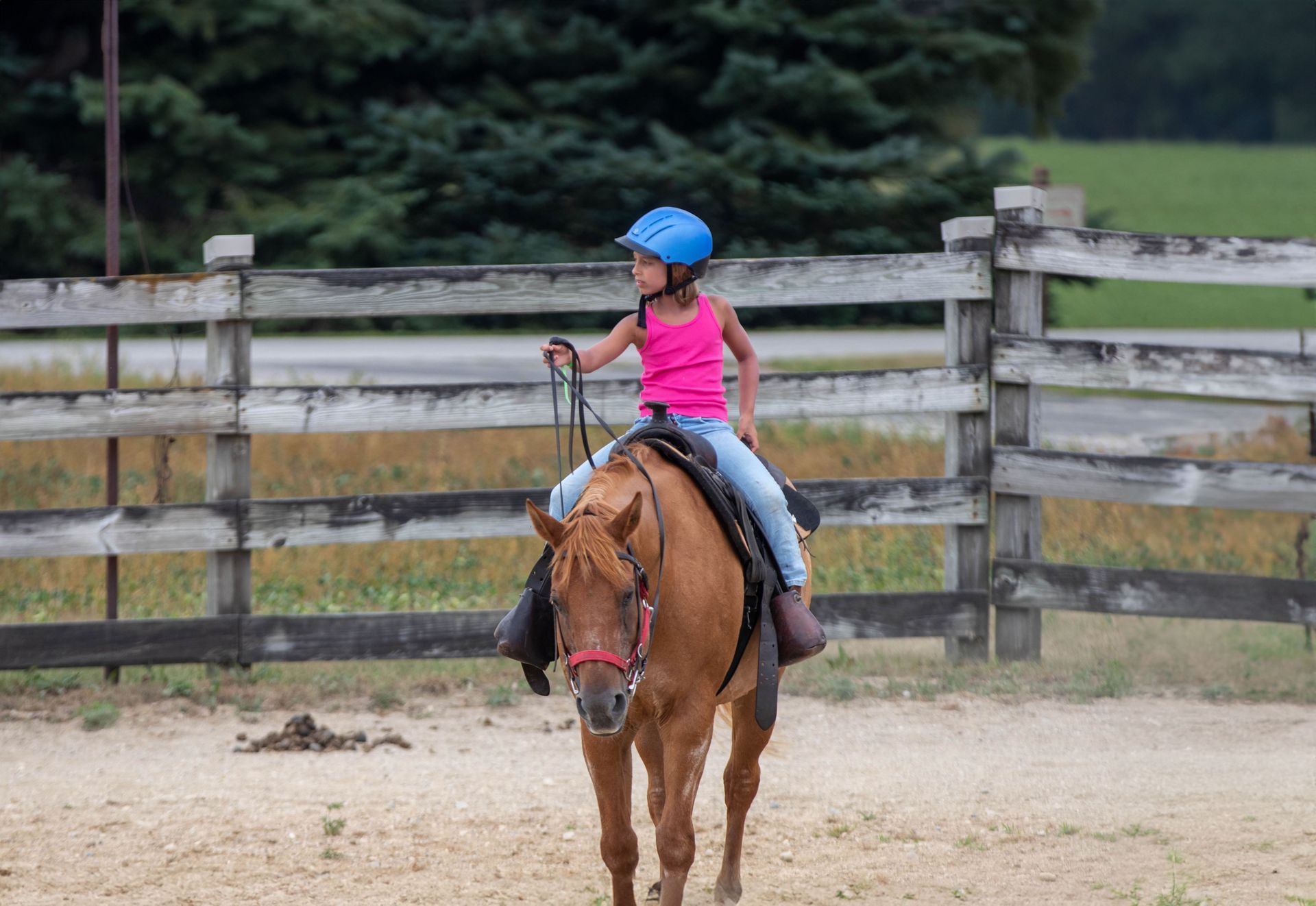 Each day includes hands-on horsemanship training, arena riding lessons, horse care, and guided trail rides across Timber-lee’s beautiful property.